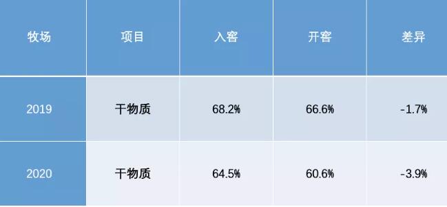 圖7所示為安徽一個(gè)牧場2019年和2020年兩年所做高濕玉米的差異。2019年入窖的高濕玉米干物質(zhì)68%、水分32%,開窖之后干物質(zhì)66.6%,下降1.7%,損耗較小。2020年由于各種客觀條件,入窖時(shí)干物質(zhì)只有64.5%,開窖之后下降到60.6%,損失3.9%,損失較大。