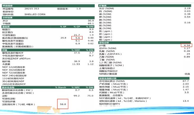 第二,要通過監(jiān)控pH值掌握發(fā)酵是否充分,pH值4.5,略高。然而,大家可以從圖6中看出,氨態(tài)氮含量和pH值這兩個(gè)指標(biāo)非常好的情況下,淀粉消化率反而不高,只有58.8%。前面圖2氨態(tài)氮達(dá)到5%左右時(shí),瘤胃7小時(shí)淀粉消化率能達(dá)到72%,這么大的差異是什么原因造成的呢?除了取樣誤差或者檢測誤差,跟品種、玉米粉碎細(xì)度都有關(guān)系,可能碾壓的玉米粉碎較粗,影響未來淀粉消化率??傊@些指標(biāo)要綜合對(duì)比,并不是氨態(tài)氮夠了淀粉消化率就夠了這么簡單。