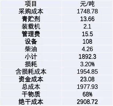 應(yīng)該估算未來它的使用成本是多少,跟玉米顆粒、壓片玉米相比,價(jià)格差異較大或是不劃算就不要做了。圖4所示是某場高濕玉米成本核算,當(dāng)時(shí)采購的濕玉米,成本1748元;青貯劑、裝載機(jī)、管理費(fèi)、租用的加工設(shè)備、柴油費(fèi)用等合計(jì)約140-150元,這些項(xiàng)成本約1890元(1750元+140元);這個(gè)場損耗3.2%,還算不錯(cuò),含損耗成本是1954元;成本核算還須考慮資金成本,每次做三五千噸高濕玉米,3個(gè)月制作周期占用的資金成本約合23元;所有這些加起來即為玉米的總成本,約1977元。按高濕玉米干物質(zhì)含量68%計(jì)算,每噸高濕玉米最終的使用成本約2908元。
