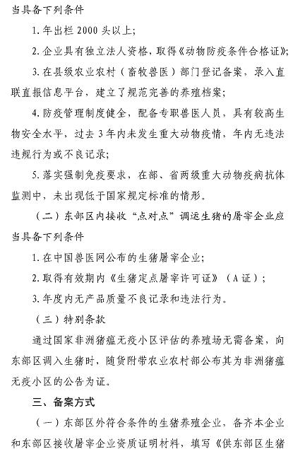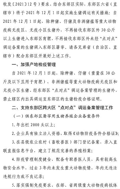 近日,東部六省市發(fā)布“關(guān)于協(xié)助東部區(qū)實(shí)施生豬調(diào)運(yùn)有關(guān)措施的函”:東部區(qū)將于12月1日起實(shí)施新的生豬調(diào)運(yùn)措施,自2021年12月1日起,除種豬、仔豬及非洲豬瘟等重大動(dòng)物疫病無(wú)疫區(qū)、無(wú)疫小區(qū)生豬外,不再接收東部區(qū)外30公斤以上生豬進(jìn)入東部區(qū)育肥,不再接收東部區(qū)外未經(jīng)“點(diǎn)對(duì)點(diǎn)”調(diào)運(yùn)備案的生豬調(diào)入東部區(qū)屠宰。