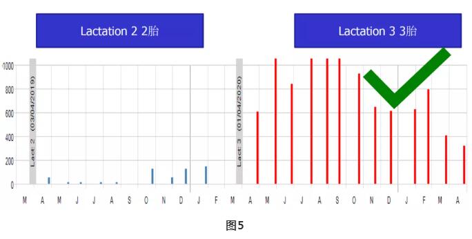 如圖5所示是泌乳期高體細(xì)胞牛的二胎和三胎情況。在二胎時(shí),牛的體細(xì)胞計(jì)數(shù)是藍(lán)色線條,均在20萬以下,沒有感染;當(dāng)牛到三胎時(shí),可以看到紅色線條顯示出的體細(xì)胞計(jì)數(shù)均高于20萬,這些牛是我們一定會決定把它放到高體細(xì)胞牛群組的牛。