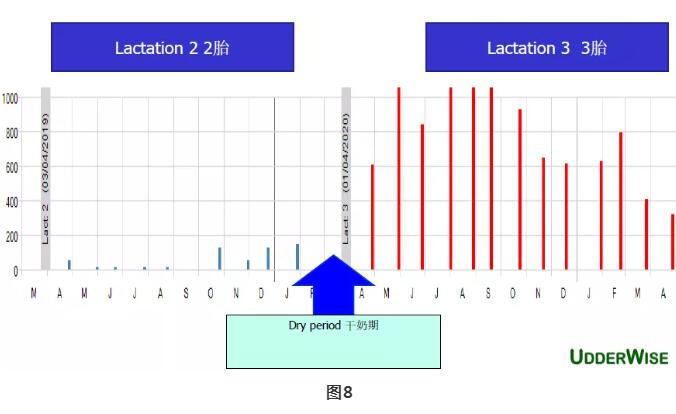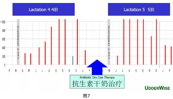 圖7所示為某母牛四胎和五胎體細(xì)胞計(jì)數(shù)??梢钥吹剑奶r(shí)紅色柱狀為10個(gè)DHIA檢測結(jié)果,其中9個(gè)體細(xì)胞計(jì)數(shù)都超過20萬,也就是說它有慢性亞臨床乳房炎,在4胎末期使用了干奶藥進(jìn)行治療,然后產(chǎn)犢;五胎時(shí),體細(xì)胞計(jì)數(shù)仍然非常高。所以該母牛在本泌乳期以及上個(gè)泌乳期都有亞臨床乳房炎,干奶治療失敗,我們可以考慮淘汰。