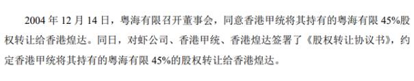 而公司的另一法人股東“香港甲統(tǒng)”實(shí)際并未出資,其所持股份實(shí)際代湛江市霞山區(qū)國(guó)有資產(chǎn)經(jīng)營(yíng)公司(以下簡(jiǎn)稱“霞山國(guó)資”)持有。而據(jù)天眼查顯示,香港也于2003年5月公告解散,但其卻在2004年12月,出現(xiàn)在將“湛江粵海”45%的股權(quán)轉(zhuǎn)讓給香港煌達(dá)的簽字儀式上。