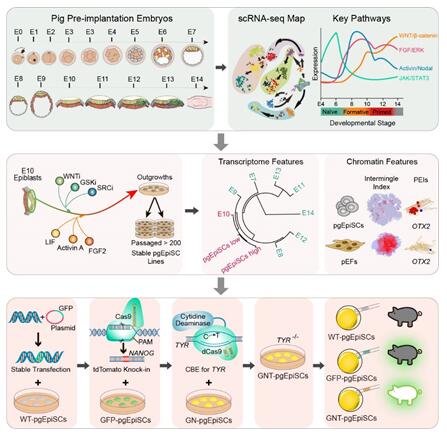 豬既是重要的家畜,也是重要的實驗動物,在基礎研究、人類疾病模型、異種器官移植等領域用途廣泛。針對家畜胚胎上胚層多能干細胞建系困難,傳代次數短,難以承受多次基因編輯操作等國際難題,中國農業(yè)大學韓建永團隊聯合四川農業(yè)大學、中國科學院動物研究所、中國科學院北京基因研究所、東北農業(yè)大學等單位,以豬為模式生物,開展了聯合科技攻關,取得家畜胚胎干細胞領域的重大突破。