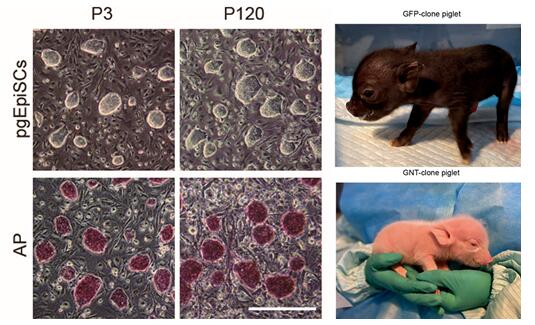 圖2 體外穩(wěn)定傳代的豬上胚層干細胞(左)及經過1次(右上)和3次(右下)基因編輯干細胞克隆豬