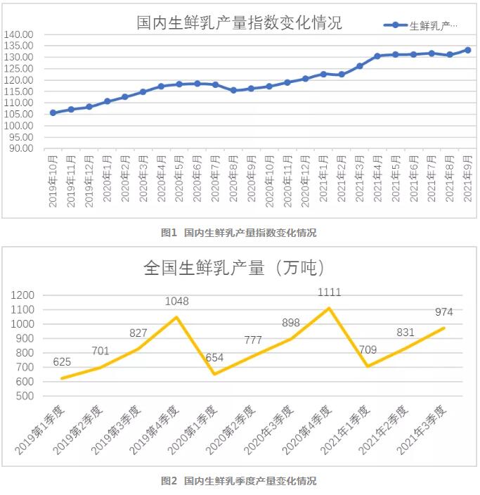 據(jù)國家統(tǒng)計局數(shù)據(jù)顯示,2021年第三季度,全國牛奶產(chǎn)量974萬噸,比去年同期增加76萬噸,增長8.5% 。