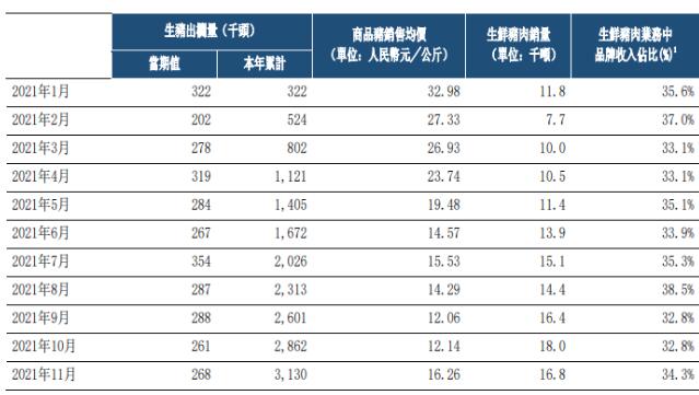 中糧家佳康披露2021年11月運營快報,當(dāng)月集團生豬出欄26.8萬頭,環(huán)比增長2.7%;本年累計生豬出欄313.0萬頭;生鮮豬肉銷量16.8千噸,商品豬銷售均價人民幣16.26元╱公斤,生鮮豬肉業(yè)務(wù)中品牌收入占比為34.3%。