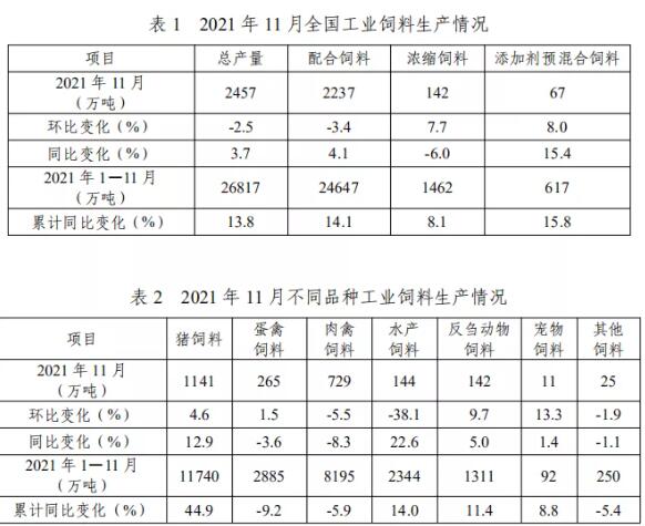 2021年1—11月,全國工業(yè)飼料總產(chǎn)量26817萬噸,同比增長13.8%。其中,豬飼料產(chǎn)量11740萬噸,同比增長44.9%;水產(chǎn)、反芻動物飼料產(chǎn)量分別為2344萬噸、1311萬噸,同比分別增長14.0%、11.4%;蛋禽、肉禽飼料產(chǎn)量分別為2885萬噸、8195萬噸,同比分別下降9.2%、5.9%。