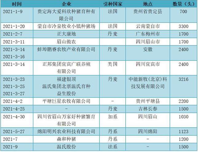 據(jù)中國飼料行業(yè)信息網(wǎng)不完全統(tǒng)計,2021年截至12月16日,中國從國外引進種豬2.4萬頭,大部分集中在上半年,已然超過2020年的2.2萬頭(數(shù)據(jù)截至2020年12月17日),從來源國看,來自丹麥的種豬占46%,來自法國的占23%,美國和加拿大各占10%和4%。而在2020年,我國從法國、丹麥、美國、加拿大和英國進口的種豬分別為43%、40%、9%、5%和3%。