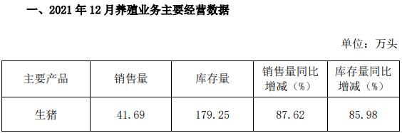 2021年12月,公司生豬銷售量41.69萬頭,銷售量環(huán)比增長1.55%,同比增長87.62%。