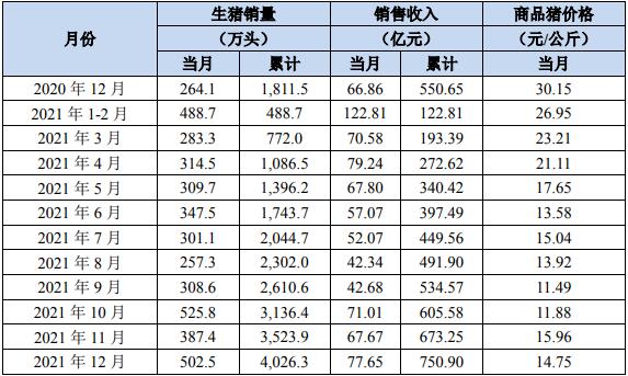 2021年12月份,公司銷售生豬502.5萬頭(其中仔豬銷售3.7萬頭),銷售收入77.65億元。其中向全資子公司牧原肉食品有限公司及其子公司合計銷售生豬39.1萬頭。