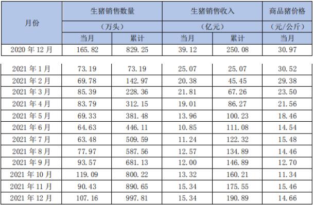 公司2021年12月銷售生豬107.16萬頭,環(huán)比變動18.50%,同比變動-35.38%;收入為15.34億元,環(huán)比變動0.00%,同比變動-60.79%;商品豬銷售均價(jià)14.66元/公斤,環(huán)比變動-5.17%,同比變動-52.66%。