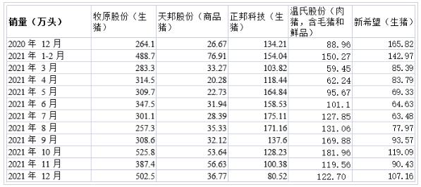 五大上市豬企2021年生豬銷(xiāo)量簡(jiǎn)況