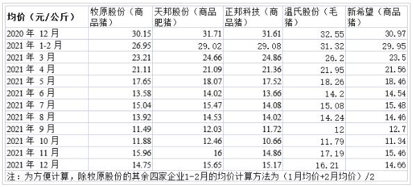五大上市豬企2021年商品豬均價(jià)簡(jiǎn)況