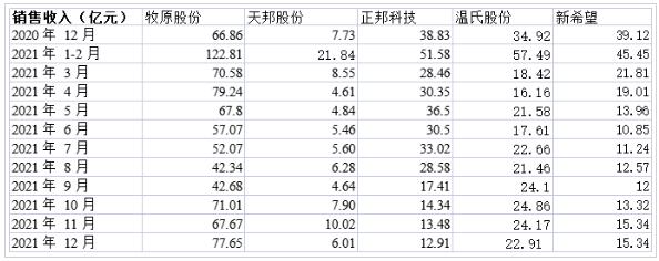 五大上市豬企2021年銷(xiāo)售收入情況