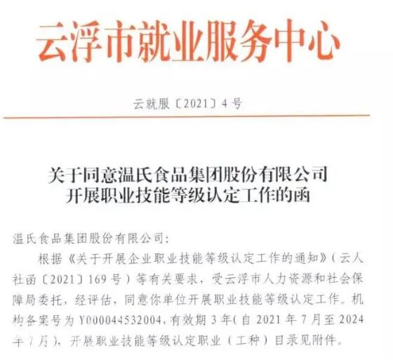 據(jù)悉,經(jīng)云浮市、新興縣人力資源和社會(huì)保障局的多次考察和評(píng)審,2021年7月,溫氏股份獲得了云浮市就業(yè)服務(wù)中心發(fā)布的《關(guān)于溫氏食品集團(tuán)股份有限公司開展職業(yè)技能等級(jí)認(rèn)定工作的函》。