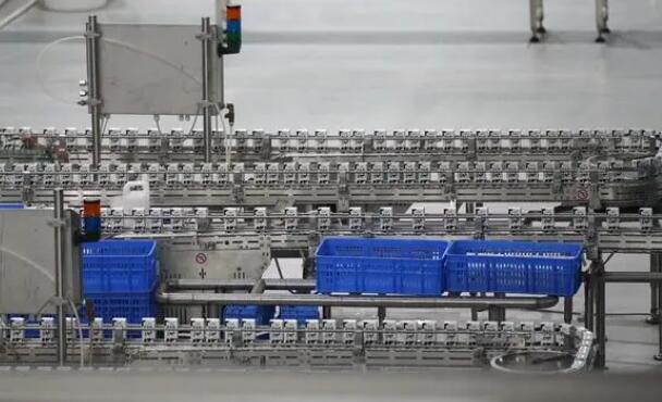 在呼圖壁種牛場下游企業(yè)車間里,剛灌裝的盒裝牛奶正被送去包裝。(新華社記者 張嘯誠 攝)