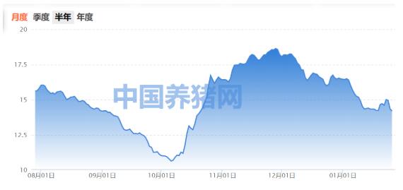 中國養(yǎng)豬網(wǎng)數(shù)據(jù)顯示,截至1月25日,全國外三元生豬價格報14.35元/公斤,是自2021年10月份豬價反彈以來的新低點。