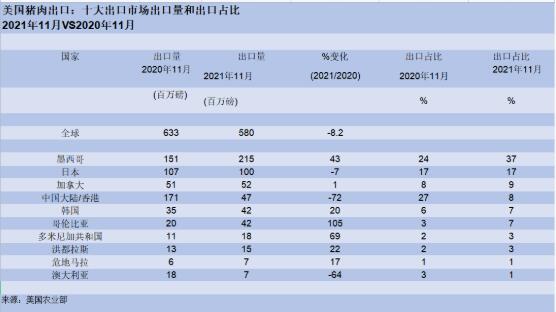 中國(guó)海關(guān)數(shù)據(jù)顯示,2021年1月至11月豬肉進(jìn)口量同比下降近12%。按出口國(guó)劃分的進(jìn)口明細(xì)顯示,西半球國(guó)家占下降幅度的最大份額:中國(guó)對(duì)美國(guó)豬肉的進(jìn)口量與2020年同期相比下降了近41%。