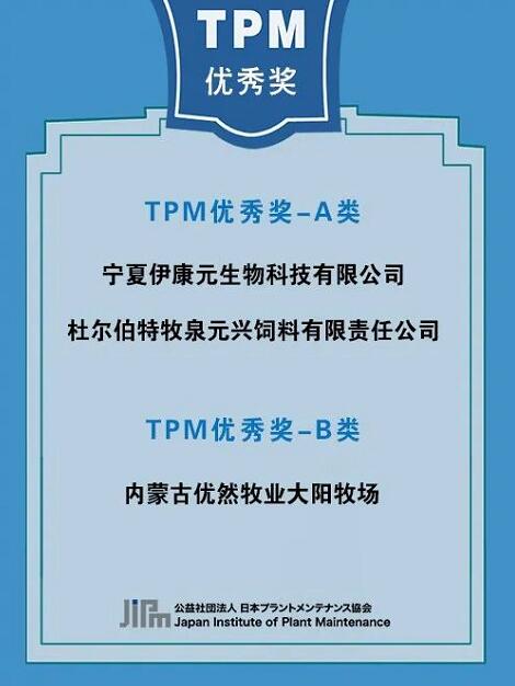 TPM獎(jiǎng)作為一個(gè)業(yè)內(nèi)久負(fù)盛名的國(guó)際獎(jiǎng)項(xiàng),更是生產(chǎn)精細(xì)化、高標(biāo)準(zhǔn)、高品質(zhì)的代名詞。獎(jiǎng)項(xiàng)準(zhǔn)入門檻極高,評(píng)選過程也十分嚴(yán)格,通過申請(qǐng)審查的企業(yè)須在一年中接受兩次日本專家組的現(xiàn)場(chǎng)審核,涵蓋企業(yè)管理的多個(gè)方面,每項(xiàng)準(zhǔn)則下又分為多個(gè)細(xì)則。作為全球最大的原奶供應(yīng)商,優(yōu)然牧業(yè)已經(jīng)在全國(guó)15個(gè)省份布局73座規(guī)?;翀?chǎng),奶牛存欄量近38萬頭,公司規(guī)模化經(jīng)營(yíng)模式和標(biāo)準(zhǔn)化的養(yǎng)殖理念與精益管理非常契合,有利于精益標(biāo)準(zhǔn)化管理工具的推廣應(yīng)用。優(yōu)然牧業(yè)不僅成為首家導(dǎo)入TPM管理的牧業(yè)企業(yè),還在精益推進(jìn)過程中成功摸索出一套更適合牧業(yè)行業(yè)的精益管理方法,不斷改善提升企業(yè)的管理運(yùn)營(yíng)能力,為行業(yè)內(nèi)推行精細(xì)化管理開了個(gè)好頭。