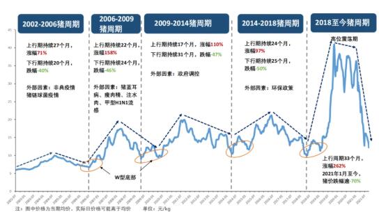 根據(jù)國海證券,2002年至2006年的這輪豬周期,上行周期為2002年7月到2004年8月,下行周期為2004年9月至2006年7月;2006年至2009年的這輪周期,上行周期為2006年8月至2008月3月,下行周期為2008年4月至2009年5月。