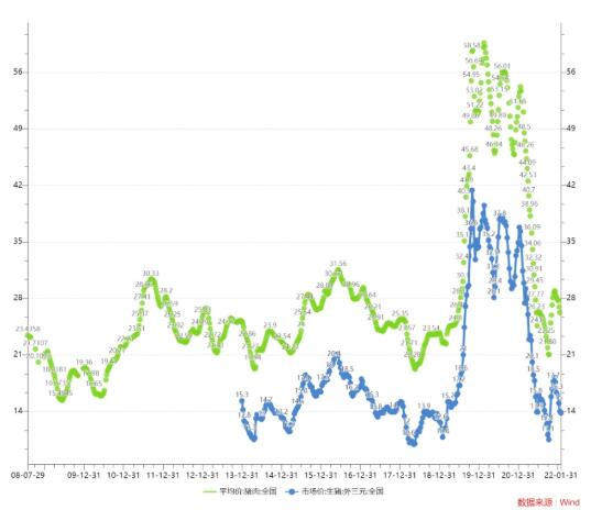 本輪周期的下行從2021年1月開始,全國豬肉平均價格從54.22元/公斤持續(xù)下降,7月有小幅波動,此后繼續(xù)下降,到10月中旬下降到21.03元/公斤后連漲近兩月,12月上旬到28.91元/公斤后,又開始下降。生豬(外三元)市場價格也在去年1月從36.8元/公斤下降,至10月上旬的最低點10.5元/公斤后上漲,到11月下旬的18.2元/公斤后開始下跌。據(jù)國家統(tǒng)計局最新公布的數(shù)據(jù),2022年1月下旬生豬(外三元)價格為13.8元/公斤。