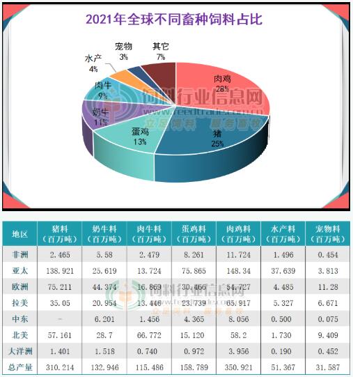 產(chǎn)量最高的三個(gè)區(qū)域仍然是亞太、歐洲和北美,產(chǎn)量分別為4.58億噸、2.67億噸和2.53億噸,其中亞太地區(qū)增長(zhǎng)量最大,同比去年增長(zhǎng)5.7%,這不僅僅由于全球前十大飼料生產(chǎn)國(guó)中國(guó)、印度、日本均在亞太地區(qū),而且中國(guó)和印度增長(zhǎng)之快;其次歐洲降幅最大,達(dá)1.2%,主要因?yàn)榉俏?、原料成本高、終端產(chǎn)品價(jià)格低迷、反芻飼料產(chǎn)量下降以及新冠等因素的影響。