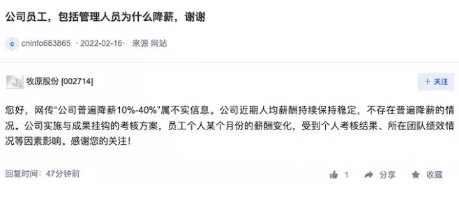 不過(guò)在2月19日,牧原股份在深交所“互動(dòng)易”平臺(tái)回答投資者提問(wèn)時(shí)稱:網(wǎng)傳“公司普遍降薪10%-40%”屬不實(shí)信息。