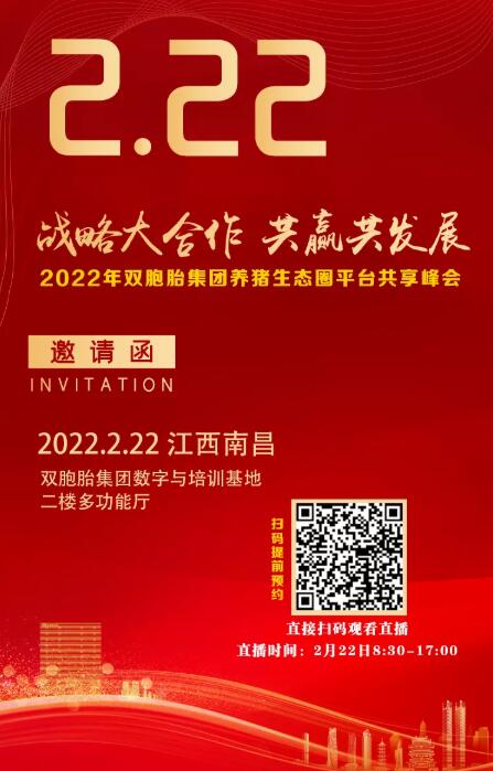 多年來,雙胞胎一直在積極探索與大企業(yè)、大豬場合作的更好模式。為此,雙胞胎集團將于本月22日在南昌舉辦以“戰(zhàn)略大合作 共贏共發(fā)展”為主題的養(yǎng)豬生態(tài)圈平臺共享峰會。本次峰會宗旨也是為大家搭建一個行業(yè)交流探討的高端平臺,共同探討如何抓住時代機遇,實現(xiàn)更好的合作,共贏共發(fā)展!