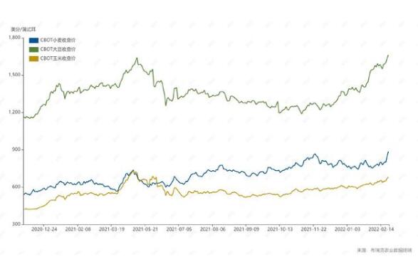 2月23日,CBOT小麥期貨上漲至每蒲式耳8.76美元,創(chuàng)下2012年12月以來的最高水平;大豆期貨最高上漲至每蒲式耳16.75美元,達(dá)到9年來的高位;玉米期貨市場收盤上漲,其中5月期約創(chuàng)下近十年來的最高水平。