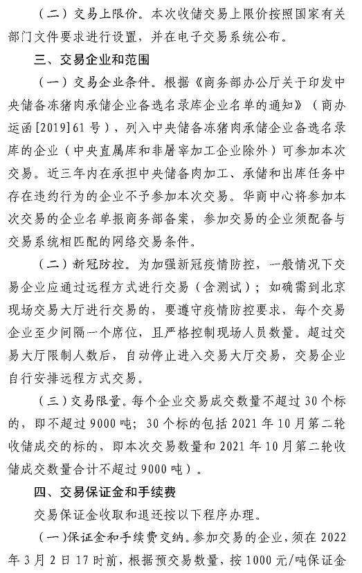 華儲(chǔ)網(wǎng)2月28日消息,2022年第一輪第2次中央儲(chǔ)備凍豬肉收儲(chǔ)競價(jià)交易2.06萬噸。交易時(shí)間為2022年3月4日下午13時(shí)至16時(shí)。
