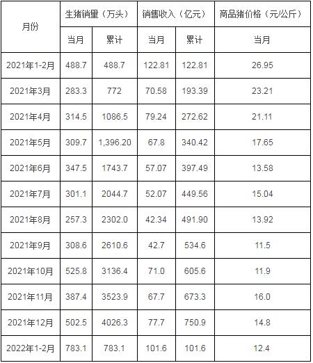2022年1-2月份,公司商品豬銷(xiāo)售均價(jià)12.38元/公斤,比2021年12月份下降16.07%。