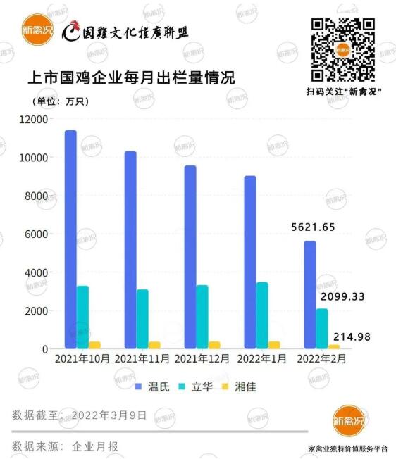 銷售簡報顯示,2月份溫氏、立華、湘佳的國雞銷售量分別為5621.65萬只(含毛雞、鮮品和熟食)、2099.33萬只、活禽214.98萬只。銷量環(huán)比下降明顯,分別下跌37.67%、39.6%、44.39%。