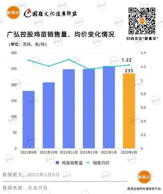 受市場行情變化影響,2月雞苗行情持續(xù)低迷,市場需求減少,種苗企業(yè)銷量下跌。廣弘控股銷售簡報顯示:2月份商品代雞苗銷量為235萬羽,收入296萬元,雞苗銷售均價1.26元/羽,環(huán)比變動分別為-8.7%、-2.9%、5.9%,同比變動分別為19.6%、-18.7%、-31.9%。