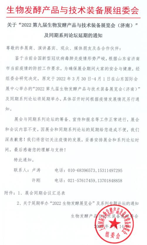 2、關(guān)于延期舉辦“2022生物發(fā)酵展覽會(huì)”及系列專題論壇的通知