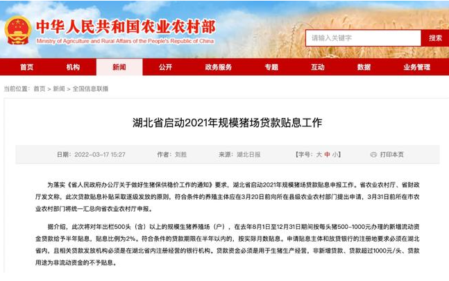 去年下半年以來,豬肉價格持續(xù)下跌,養(yǎng)豬企業(yè)普遍出現(xiàn)虧損。為幫助企業(yè)渡過難關(guān),促進生豬行業(yè)健康穩(wěn)定發(fā)展,湖北省雙管齊下,在近期開展凍豬肉儲備收儲工作后,此次又及時啟動貸款貼息工作。