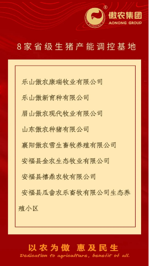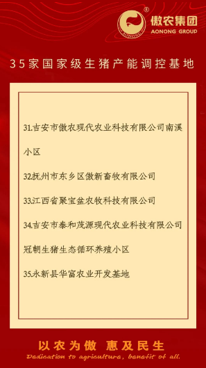 ?? 為進(jìn)一步積極響應(yīng)國(guó)家政策號(hào)召,促進(jìn)生豬產(chǎn)業(yè)持續(xù)健康發(fā)展,確保豬肉供應(yīng)安全有保障,傲農(nóng)集團(tuán)按照豬場(chǎng)自愿加入并配合開(kāi)展產(chǎn)能調(diào)控的原則,建立生豬產(chǎn)能調(diào)控基地。日前,傲農(nóng)集團(tuán)共有35家子公司入選為國(guó)家級(jí)生豬產(chǎn)能調(diào)控基地,8家子公司入選為省級(jí)生豬產(chǎn)能調(diào)控基地。
