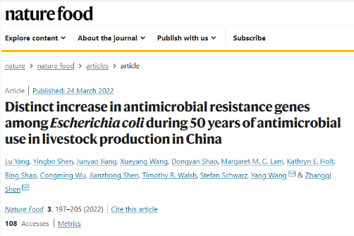 3月25日,《自然》雜志旗下期刊Nature Food在線發(fā)表了中國農(nóng)業(yè)大學(xué)動物醫(yī)學(xué)院沈建忠院士團(tuán)隊題為“養(yǎng)殖業(yè)抗菌藥物50年使用史促進(jìn)動物源大腸桿菌耐藥基因劇增”(Distinct increase in antimicrobial resistance genes among Escherichia coli during fifty years of antimicrobial use in livestock production in China)的封面文章。