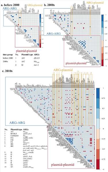 進(jìn)一步分析發(fā)現(xiàn)細(xì)菌中質(zhì)粒的攜帶數(shù)量以及多樣性隨時間顯著增加,而多種質(zhì)粒在基因組中與耐藥基因存在顯著相關(guān)性,是介導(dǎo)重要耐藥基因傳播頻率增加的主要載體,表明質(zhì)粒多樣性是加速重要耐藥基因傳播頻率增高的重要原因。同時,在不同年代,與質(zhì)粒存在顯著相關(guān)性的耐藥基因也在發(fā)生變化,揭示了質(zhì)粒也同樣存在適應(yīng)性進(jìn)化過程(圖2)。