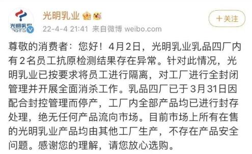 針對以上問題,光明乳業(yè)答復上海辟謠平臺表示:4月2日,光明乳業(yè)乳品四廠內(nèi)有2名員工抗原檢測結果存在異常。針對此情況,光明乳業(yè)已按要求將員工進行隔離,對工廠進行全封閉管理并開展全面消殺工作。乳品四廠已于3月31日因配合封控管理而停產(chǎn),工廠內(nèi)全部產(chǎn)品均已進行封存處理,絕無任何產(chǎn)品流向市場。目前市場上所有在售的光明乳業(yè)產(chǎn)品均由其他工廠生產(chǎn),不存在產(chǎn)品安全問題。