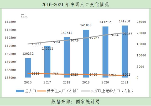從2016-2021年中國(guó)人口結(jié)構(gòu)變化情況來(lái)看,老齡人口數(shù)量正在逐年增長(zhǎng),人口老齡化程度加深。