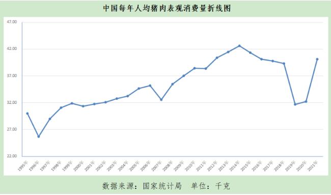 據(jù)朱增勇團(tuán)隊(duì)研究顯示,按人口折算,中國(guó)每年人均豬肉表觀消費(fèi)量從2015年開(kāi)始連續(xù)5年小幅下降,盡管2021年有所反彈,同比大幅增長(zhǎng)24.5%,但也并未超過(guò)2014年最高水平。
