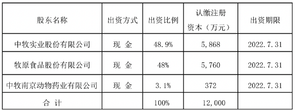據(jù)悉,中牧牧原注冊資金12,000萬元,其中:中牧股份以現(xiàn)金方式出資5,868萬元,占注冊資本的48.9%;牧原股份以現(xiàn)金方式出資 5,760萬元,占注冊資本的48%;南京藥業(yè)以現(xiàn)金方式出資372萬元,占注冊資本的3.1%。