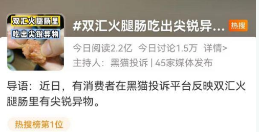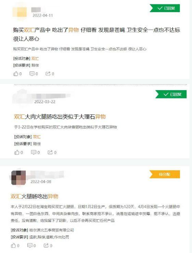 截至目前,記者在黑貓投訴平臺發(fā)現(xiàn),關(guān)于雙匯異物的投訴達(dá)到402條。
