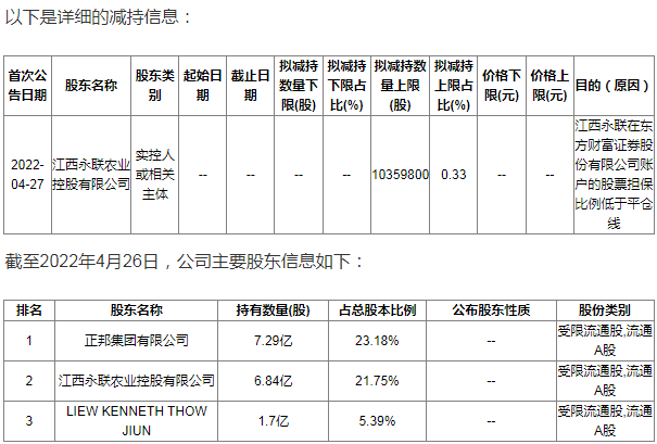 4月27日,正邦科技發(fā)布股份減持預(yù)披露公告,股東江西永聯(lián)農(nóng)業(yè)控股有限公司擬減持公司股份不超過1035.98萬(wàn)股,減持比例不超過公司總股本的0.33%。