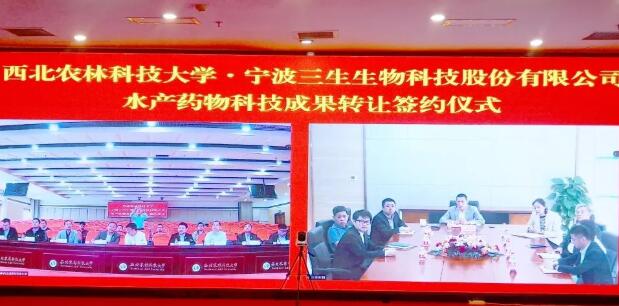 5月10日,寧波三生生物科技股份有限公司(以下簡(jiǎn)稱“寧波三生”)與西北農(nóng)林科技大學(xué)“云上”簽約儀式隆重舉行。簽約儀式上,西北農(nóng)林科技大學(xué)科技推廣處處長(zhǎng)王亞平代表學(xué)校、寧波三生周立明董事長(zhǎng)代表寧波三生,簽署了技術(shù)成果轉(zhuǎn)讓協(xié)議。寧波三生執(zhí)行總裁李琴、首席科學(xué)家翁士喬、研發(fā)總裁戴志紅、戰(zhàn)略總監(jiān)姚國(guó)良、BD部經(jīng)理周思超、生藥研發(fā)部經(jīng)理陳璐、化藥研發(fā)部經(jīng)理張浩、水產(chǎn)研發(fā)主管高原等共同見證了這一高光時(shí)刻。西北農(nóng)林科技大學(xué)副校長(zhǎng)房玉林主持了簽約儀式。