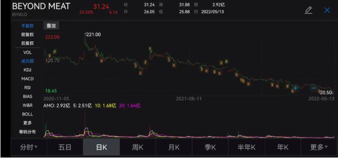 不過(guò),去年7月以來(lái),Beyond Meat的股價(jià)便一路走低。今年5月12日,公司披露低于市場(chǎng)預(yù)期的一季報(bào)后,股價(jià)盤后一度暴跌25%至20.58美元/股,不但首次跌破發(fā)行價(jià),較最高點(diǎn)更是下跌90%。