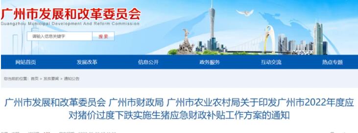 豬價過度下跌情形,指廣州市生豬出場價格豬糧比價(以廣州市價格監(jiān)測和成本調(diào)查中心的監(jiān)測數(shù)據(jù)為準)連續(xù)3周處于6:1以下,或者省發(fā)展改革委網(wǎng)站發(fā)布了過度下跌二級(一級)預警情形,或者廣州市發(fā)布過度下跌二級(一級)預警情形,經(jīng)市發(fā)展改革委會市農(nóng)業(yè)農(nóng)村局、財政局研判認定達到的價格異常波動的價格過度下跌之情形。