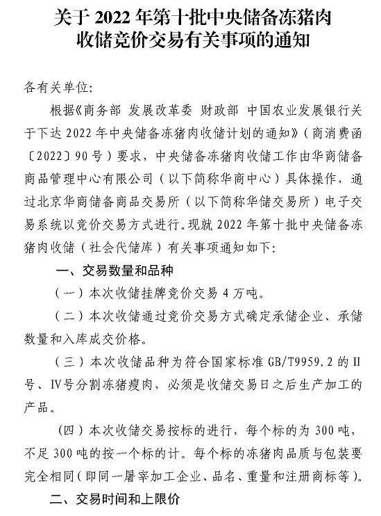 華儲(chǔ)網(wǎng)最新消息:今年第十批中央儲(chǔ)備凍豬肉收儲(chǔ)工作即將啟動(dòng),交易量為4萬噸,交易時(shí)間為6月2日下午13.00—16.00。