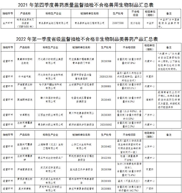 2022年第一季度完成非生物制品類獸藥產(chǎn)品省級監(jiān)督抽檢1366批,不合格18批(見附件2);部級跟蹤檢驗45批,全部合格。